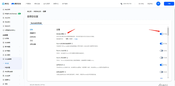 腾讯会议官网->企业管理->会议室管理->会议室->设备栏中,点击节点名称右侧的【设置】按钮,进入设置页面。