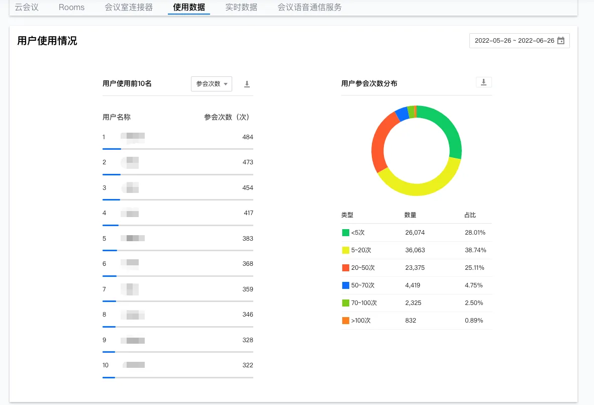 > 参会次数:所选时间段内用户参会的会议数之和,统计数据截止到昨日;